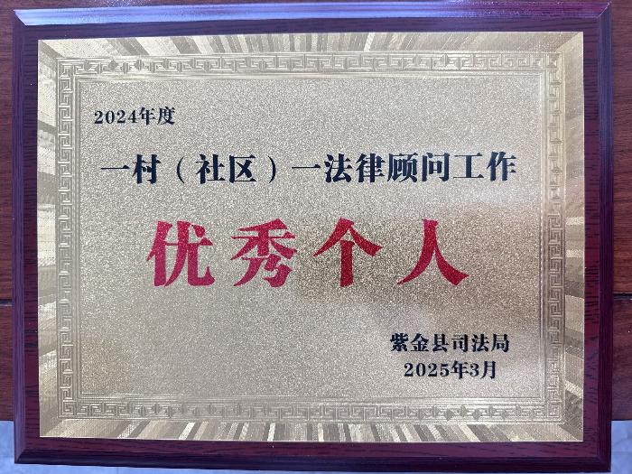 (圖為紫金縣司法局頒發(fā)的優(yōu)秀個人牌匾)